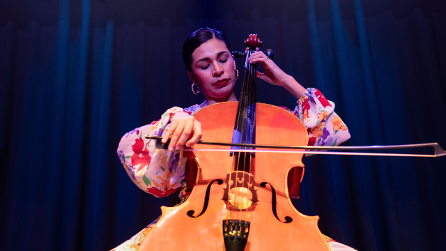 Experiencia musical en vivo con chelo, un instrumento de cuerda similar al violín pero de tamaño más grande.